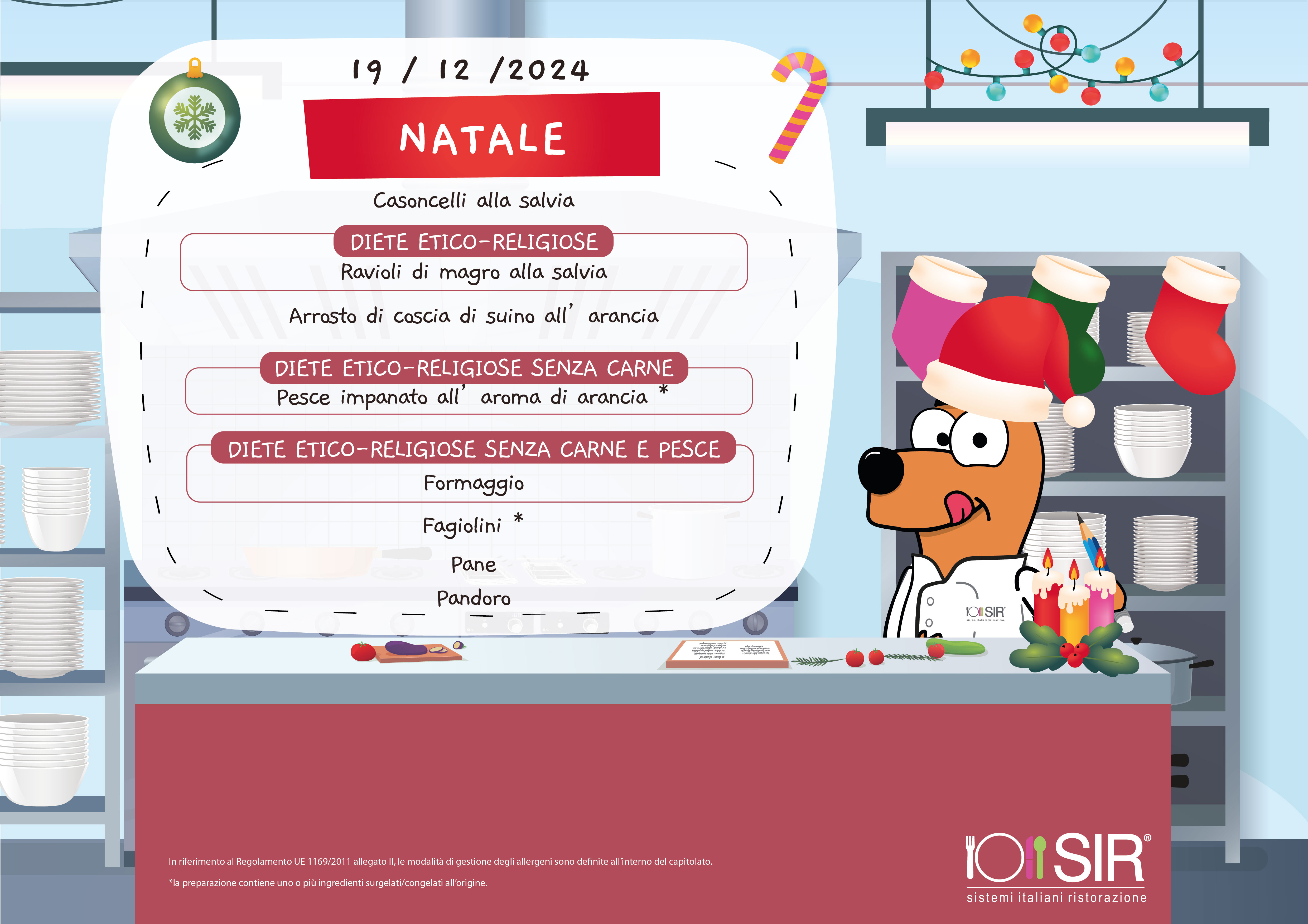 Descrizione Come da email pervenuta da parte della SIR S.r.l. si comunica che in data 19/12 verrà servito il menu speciale di dicembre, insieme al pandoro, che sostituirà la torta complemese.In allegato la locandina.